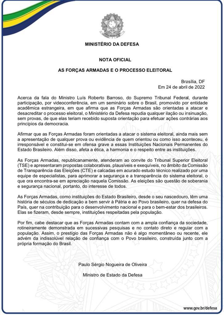 Para o ministro da Defesa, as falas de Barroso afetam "a ética, a harmonia e o respeito entre as instituições". Ele ainda cita a participação das Forças Armadas na Comissão de Transparência das Eleições (CTE), a convite do próprio ministro do Supremo e ex-presidente do