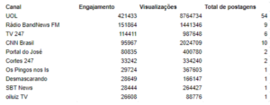 Das dez publicações com maior engajamento, temos vídeos veiculados pelo Portal do José, TV 247, Rádio Band News (com comentário crítico de Reinaldo Azevedo) e UOL. Houve, portanto, prevalência de conteúdos vinculados ao campo lulista ou de grupos de comunicação que criticaram a fala do presidente. Dos associados ao bolsonarismo, os canais pertencentes ao youtuber OiLuiz TV e ao programa Os Pingos nos Is, da Jovem Pan, tiveram ampla repercussão.