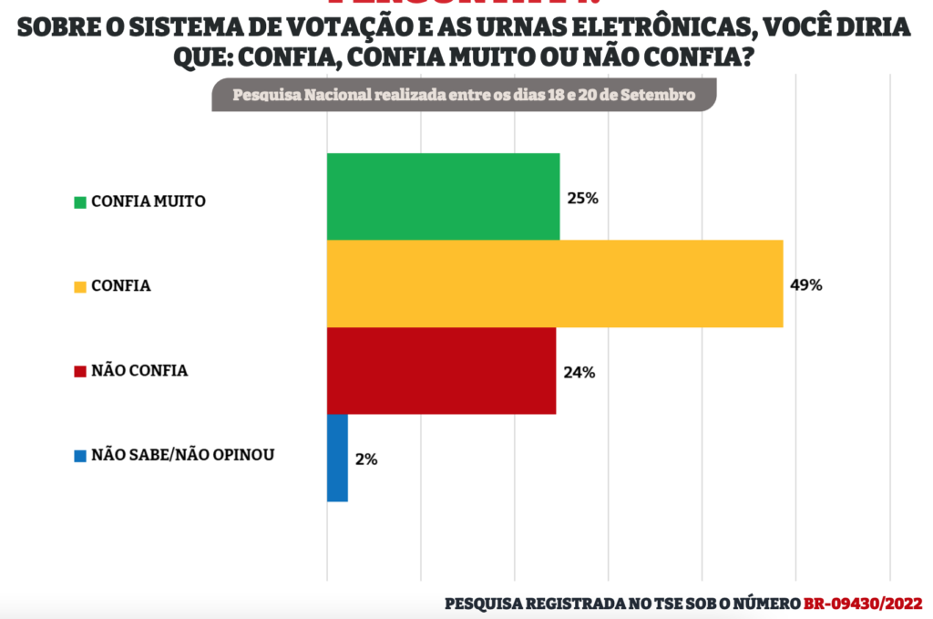 "As fake news distribuídas diariamente sobre o tema acabam por gerar insegurança até entre aqueles que sempre confiaram muito nas urnas e agora dizem apenas confiar”, disse o diretor. Os 24% dos que não confiam nas urnas estão ligados aos militantes do atual presidente. “Boa parcela desse número está ligado àqueles eleitores mais próximos ao presidente. São eleitores mais fiéis, que confiam em suas falas e que, portanto, começaram engrossar o discurso de ataque às urnas”, completou.