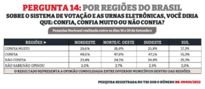 O Instituto Opinião fez um recorte sobre a opinião dos eleitores sobre as urnas e o sistema eleitoral brasileiro por região. Chama a atenção o fato de a região Sul, onde o presidente mantém um eleitorado mais fiel, ter a pior média dos que acreditam nas urnas. As regiões Nordeste lidera com 26,6% dos eleitores que acreditam muito nas urnas. Ela é seguida pelas regiões Norte e Centro Oeste, que mantêm 26% dos que acreditam muito. O Sudeste tem 25,8%. No Sul, o índice é o mais baixo, com 17,3%.