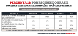 A pesquisa também fez um recorte por região. A região Sul foi a única que manteve abaixo dos 80% quando o assunto foi a preferência pela democracia, com 79,3%. Nas outras regiões o índice foi acima de 80%. O Nordeste com 83,2%, as regiões Norte e Centro-Oeste, com 87%, e Sudeste, com 88,3%.